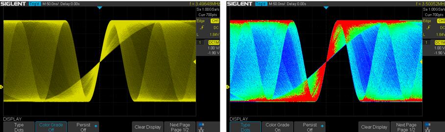 图A: SPO 显示技术是高刷新率和多帧叠加的结果,当单位时间内,当某一像素点出现的波形概率越高,该像素点就越亮,反之越暗