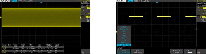 图F:根据不同的应用场景和测量需求,通过 Save 菜单,把示波器的当前参数 预设为 Default 参数,任一时刻即可通过 Default 按键一键恢复预设参数,操作方便快捷,实现个性化需求。