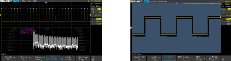 图H: SDS1000X-C 实现了基于硬件的 Pass/Fail 测试功能,每秒执行高 50,000 次测试。可根据用户自定义的垂直和水平容限,将被测信号与标准规则的同一信号进行比较,适用于长期监测信号或进行生产线测试。