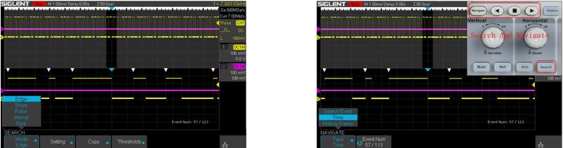 SDS1000X-C 通过指定条件,对一帧波形进行自动搜索,并把搜索结果标识出来,结合导航功能,快速的定位到感兴趣的事件,然后结合示波器的分析功能对事件进行详细的分析,省去了手动搜索的耗时和不便。导航可以对搜索事件导航,也可以对时间和历史帧导航。