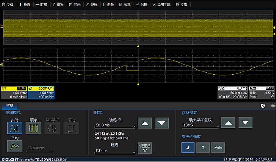 在运行状态时,处理器可以读取不压缩的10Mpts原始采集点用于测量,通过协处理器加速测量过程,无论是stop还是run状态都可以对10Mpts进行高速的测量分析;