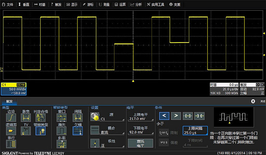 具有丰富的触发功能,包括边沿,脉宽,判定合格,逻辑图,TV,窗口,间隔,漏失,欠幅,斜率,IIC,SPI,UART/RS232,LIN,CAN;