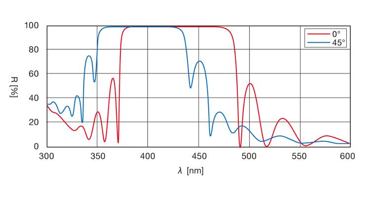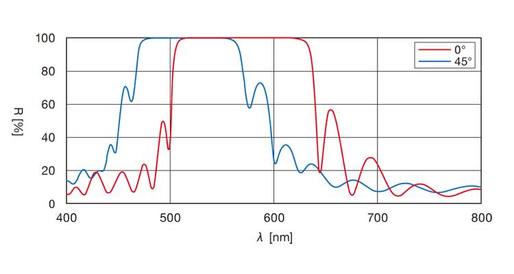 入射角固定时,可用的波长范围较宽。例如,TFVM-800,45°入射时,在730〜900nm波长范围,其反射率均大于99%。