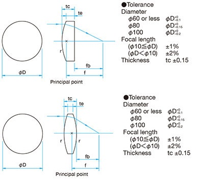 此款透镜有两种类型,一种是平凸,一种是双凸,除了没镀膜的产品外,还提供镀了可见光/近红外/红外用防反射膜的标准透镜系列,而且,经济型球面平凸透镜(φ6~φ25)除表面质量外,其他技术指标与球面凸透镜(SLB-P)相同。如果不是用于激光高精度实验,推荐使用本系列透镜。
