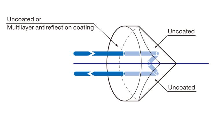 角锥棱镜的3个反射面交叉的棱线有倒角,从入射·出射面观察时可以 看到6根不反射光束的呈放射状棱线。使用细的激光光束时,请不要使光束接触到这6根棱线。