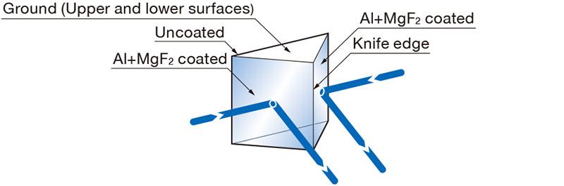 直角棱线部的刀口非常容易破损,千万不能和其他物品碰撞。刀口部不能使用镜头纸等擦拭。如果发现有异物附着,请用气囊吹。实测的尺寸A包含了倒角部分,所以会比样本值稍小。尺寸公差由斜面和两个底面所成三角形而定。KRPB4是镀了铝膜的,可以实现大于±5.7度入射角时的反射,但其反射率要比KRPB低大约23%(1面大约低12%)。
