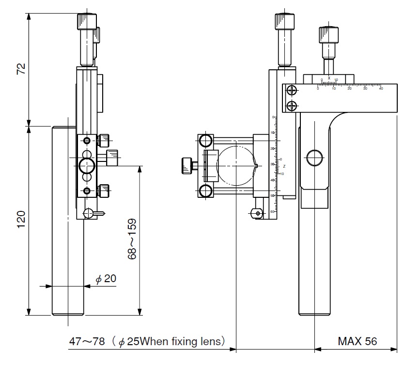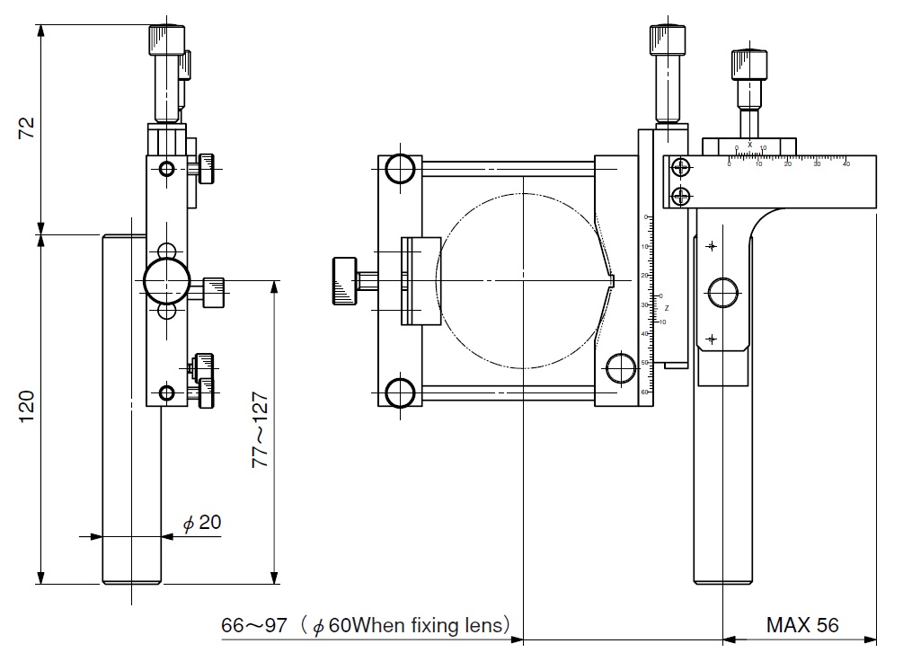 ▶可调镜架(TMEN-LHA),如果被夹持的透镜的直径有变化,则透镜和立柱的距离会变化。此时,请使用燕尾槽型平台进行调整补偿。