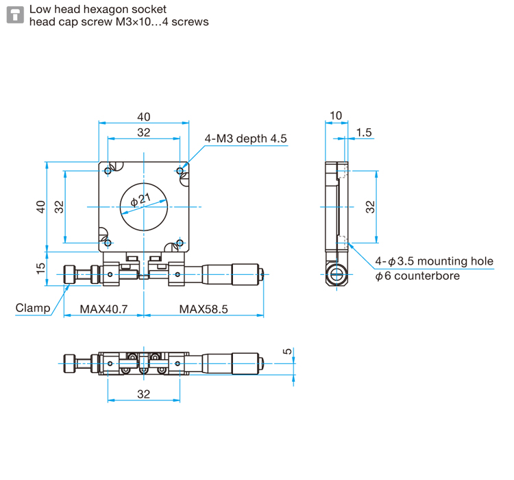 3.型号末尾为FP的产品,采用的是精密调整螺杆,请注意不是一般的微分头。精密调整螺杆的螺距为0.25mm,在操作时请使用六角扳手或另售的。