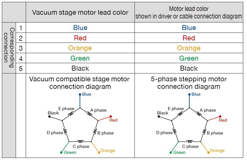 真空用平台使用的是真空用步进电机(型号:A7715-90215KV),它有5根外接导线。 接线时,请参考下图所示信息。 (注意:驱动器等说明书中提到的电缆接线图中所示的电机导线,都是普通步进电 机用的接线图。如下图所示,它们的接线图是不同的。)